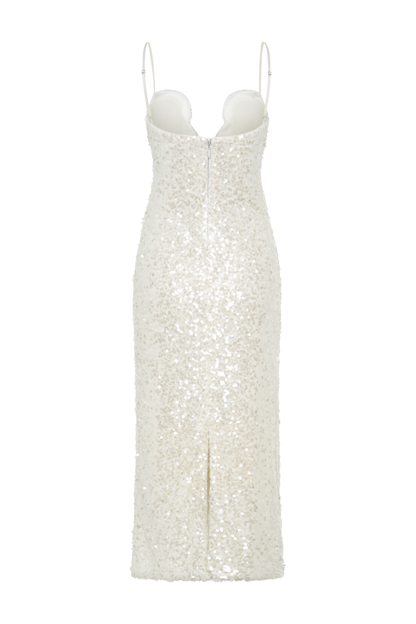 The MAKARI Sequin Maxi Dress is designed to shine with every step. Featuring a shaped plunge neckline with internal wiring for structure, this fitted silhouette contours the body with effortless allure. Crafted from stretch sequin fabrication, it offers both comfort and high-impact glamour. The straight skirt falls to an elegant midi length, complete with a back vent for ease of movement. Adjustable straps ensure a customisable fit, while the fully lined design and back zip with hook-and-eye closure provide a seamless finish. Perfect for evening soirées, statement moments, and turning heads all night long.